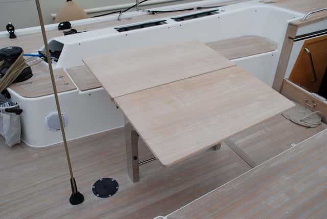 Desde el palo hacia proa, nada obstaculiza la circulación. Hacia popa, el tejadillo también está totalmente libre, ya que no hay pianos de drizas. En su lugar encontramos la cubierta de la toldilla, igualmente enrasada, que se despliega para dar protección a la entrada del tambucho y a la zona de descanso de la bañera. Ésta está distribuida en dos zonas bien diferenciadas, una de estar, con una mesa de dos alas abatibles y otra de maniobra situada tras los dos pedestales de gobierno inclinados hacia fuera que ofrecen así un ancho paso central. Desde aquí, bien asentados en las bandas, tenemos al alcance los winches desde donde controlamos todos los cabos de maniobra.