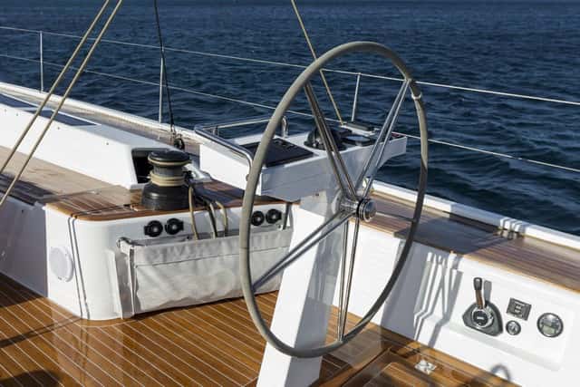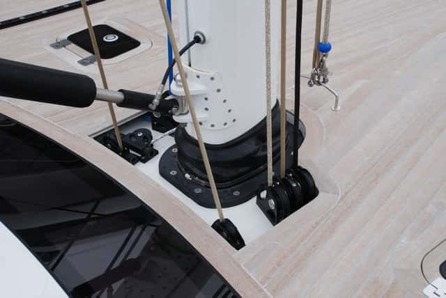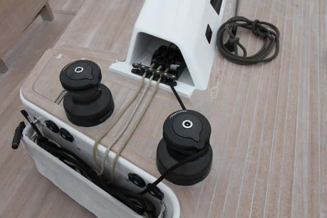 Acorde con la idea general del diseño, tanto los lados del tambucho como la bañera también están libre de cabos y obstáculos: escotas, drizas, cabos de rizo… Todo corre oculto bajo las brazolas hasta los únicos cuatro winches situados frente a las ruedas de los timones, desde donde se controla todo. Ni siquiera la escota de mayor es un obstáculo para la circulación, ya que no hay carro sino que va anclada a un cáncamo central, una opción que no placerá a los más puristas tratándose de un barco con vocación de velocidad. En pocos veleros se hace tan evidente el objetivo del diseñador de crear un velero en el que la disposición de la maniobra no malogre la armonía del conjunto. Un objetivo, hay que destacarlo, perfectamente logrado.