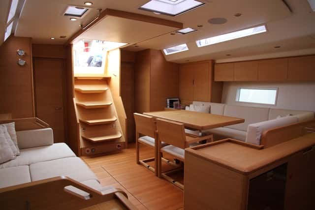 Así pues, todo el volumen inmediato a la bajada por la amplia escalera del tambucho se destina a salón y comedor, salvo el rincón de la mesa de cartas, que está reducida a su mínima expresión. Algo poco corriente en cruceros de esta eslora pero cada día más habitual dado que la electrónica y las tabletas están relegando la función de las mesas de cartas al mínimo, y en algunos modelos ya a su total desaparición. Cuenta con un amplio sofá en L a babor en torno a una mesa y con dos sillas móviles con anclaje en el plan, mientras que en la otra banda puede optarse por el habitual sofá doble o, como en la unidad que probamos, por uno de asiento ancho que ejerce a la vez de chaisse longue doble.
