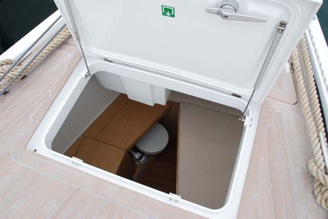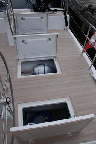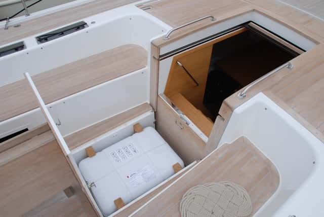 Un cofre a los pies de la entrada del tambucho esconde la balsa de salvamento, mientras que otros tres, situados tras las ruedas de los timones, permiten acceder al motor del fueraborda por el central y tener al alcance los pertrechos necesarios para el crucero en los dos de las bandas.