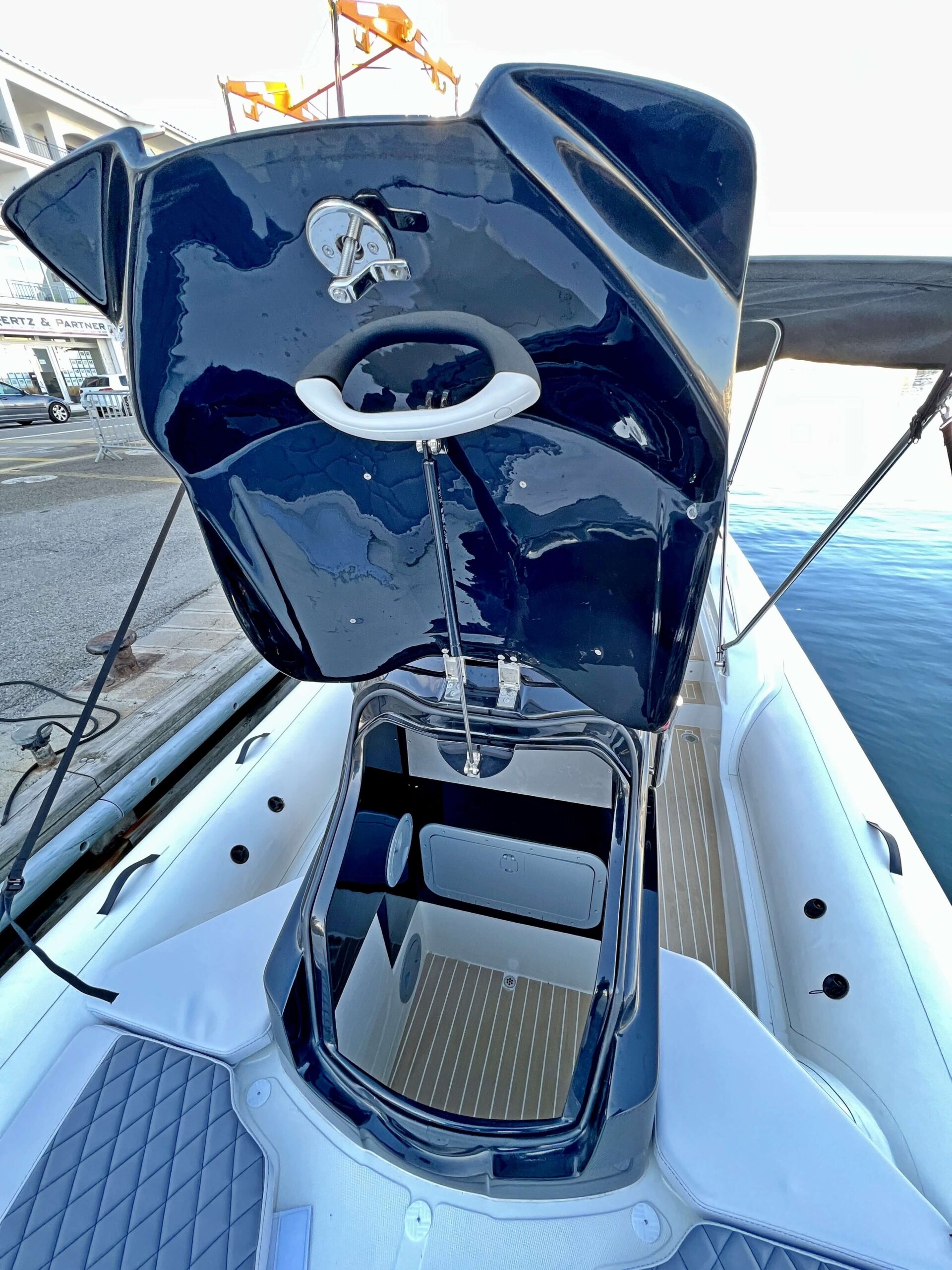 Por otra parte, debemos apuntar que existen dos versiones de esta eslora, la versión Light, más sencilla, y esta Sport, que incorpora un suelo de teca sintética, dos duchas y dos escalas de baño en la popa, un inodoro químico en la cabina, luces de respeto, sistema hidráulico de dirección y pasamanos de inoxidable, entre otros accesorios.
