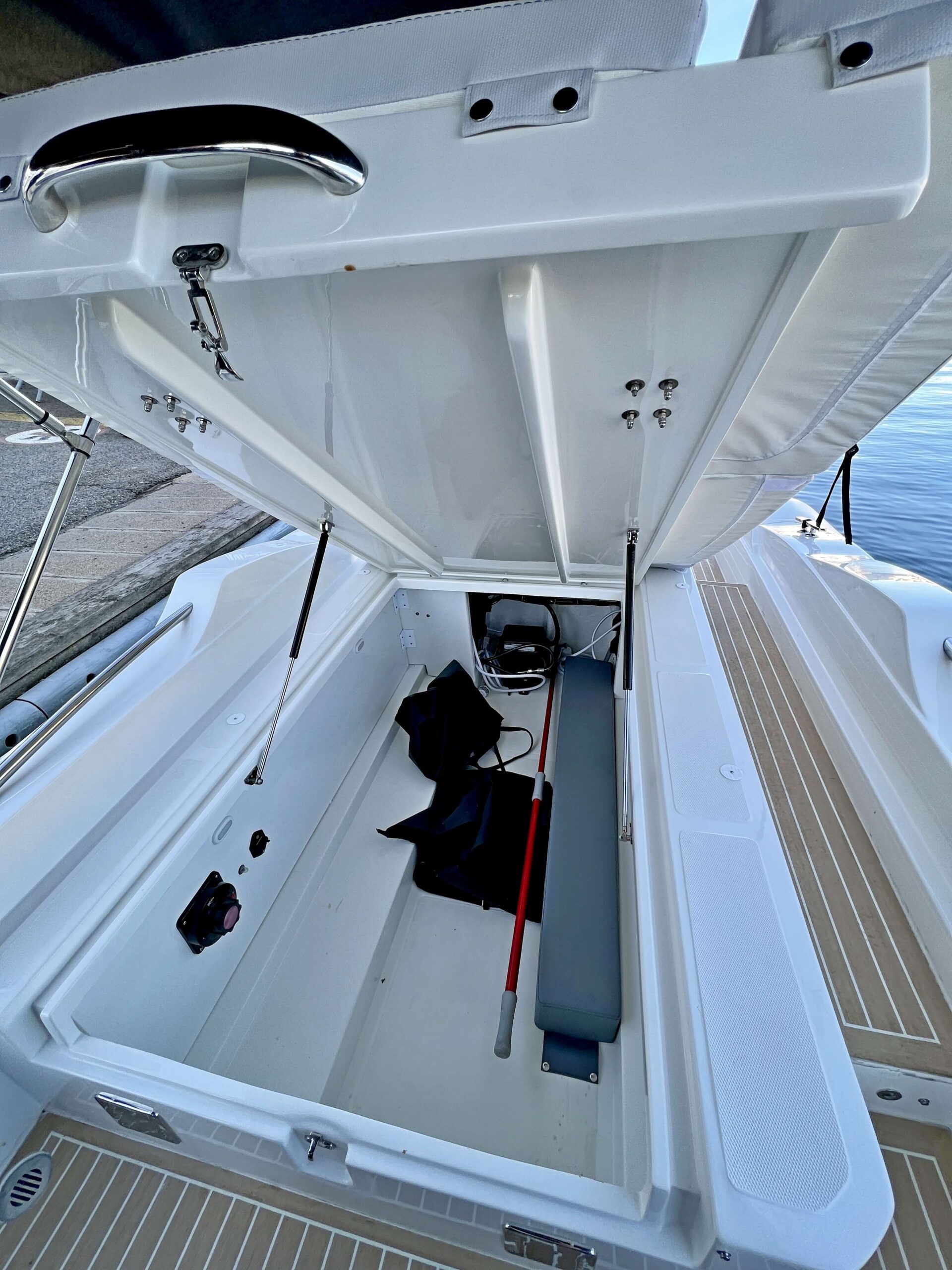 Una cabina mínima que sirve tanto de espacio para estiba como para instalar un inodoro químico, accesorio más que razonable para esta eslora. Dispone de ventilación y, curiosamente, el astillero ha cuidado este espacio como si se tratara de una cabina mayor, con gelcoat en negro en el interior, suelo de teca sintética, varios registros y un cierre de seguridad. Un espacio polivalente que complementa la ya notable capacidad de estiba de la embarcación.