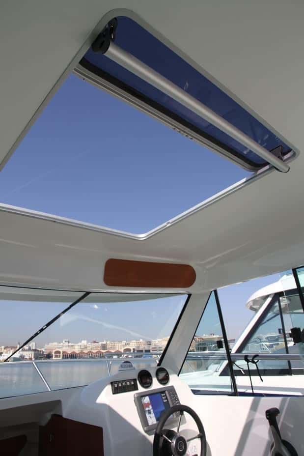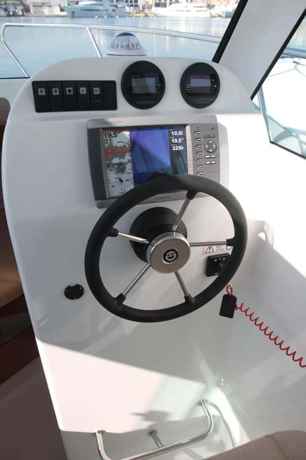 Sencillo, pero cómodo y con los indicadores suficientes del Yamaha F150. La amplitud del parabrisas permite una buena visibilidad y las grandes cristaleras laterales no impiden la visión en la maniobra. Se agradece la buena posición de la palanca de aceleración, con el power trim bien situado. No obstante, para muchos el asiento será algo bajo o la consola demasiado alta, eso depende de la estatura del patrón. Mejoraría con una guantera lateral para objetos personales, o también con un asidero de inoxidable para el acompañante que vaya de pie junto al patrón. Por lo demás, un puesto bien resuelto, sin complicaciones y adecuado a esta eslora.
