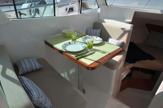 La dinete para cuatro personas ocupa la banda de babor. La mesa se puede instalar también en la bañera.