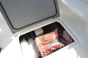 Uno de los puntos fuertes de la 650 OBS es sin duda la bañera. Amplia, versátil, ideal tanto para la pesca como para montar una dinete, dispone de paso directo a la escala de baño y cuenta con asientos plegables en el interior, además de un enorme cofre de estiba. La particularidad de poder retirar los respaldos de los asientos posteriores permite por un lado levantar totalmente el motor, dejándolo fuera del agua cuando el barco está en el amarre, y pasar a la escala de baño con suma facilidad.