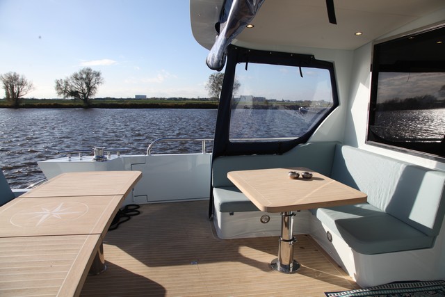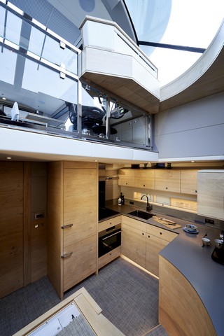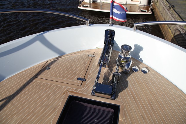 Con el gas a fondo, los dos Cummins de 410 Hp alcanzan los 12,6 nudos a 2.100 rpm, con un consumo por milla de 15,6 litros. Es una navegación tranquila, con gran estabilidad, sin apenas balanceo, silenciosa. En cuanto a autonomía, es capaz de navegar hasta 1.300 millas a 7,8 nudos; y la mínima es de unas 255 millas a 12,7 nudos.