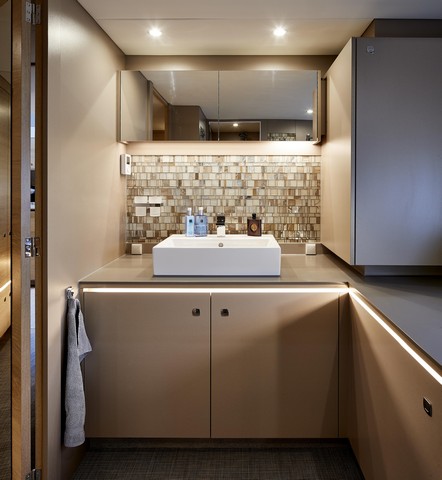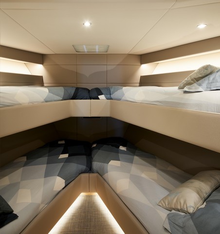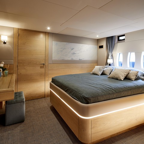 Al espacio y luminosidad natural del espacio principal se añade una zona de noche, distribuida en amplios espacios, que reparte cuatro cabinas, una a media eslora, de increíbles dimensiones, con todo tipo de detalles, como tocador, vestidos y armarios, para el armador, con su propio baño y ducha; y tres camarotes más, la especial habilitada a estribor, grande, con una gran puerta corredera lateral para facilitar la entrada de la silla y el traslado de la persona a la su cama adaptada; otra a babor con dos literas, y la de proa con cuatro literas para niños, realizada según las necesidades del propietario, además de disponer de otro baño completo.