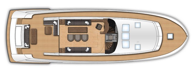 La zona principal está presidida por el salón con una gran mesa que puede acomodar hasta ocho personas. Los dos pies eléctricos telescópicos pueden ajustarla para convertir el sofá en una cama doble adicional a las cuatro cabinas de la zona de noche.