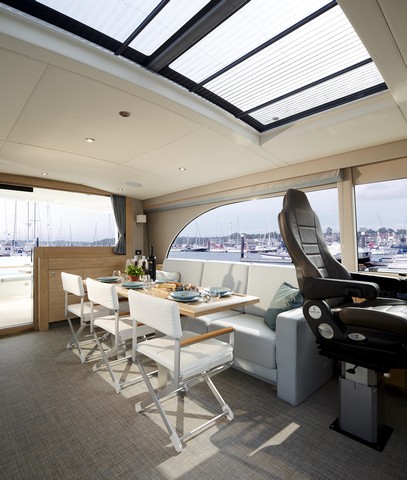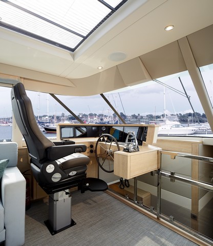 Como en otros barcos, aquí Steeler también ha instalado una silla para patrón dotada de todos los ajustes, con el piloto automático en uno de los reposabrazos. Un puesto propio de un superyate, que disfruta de una visión panorámica de 360 grados, como el resto del salón.