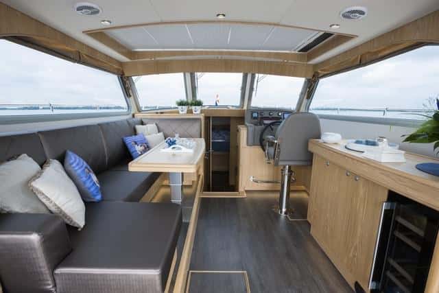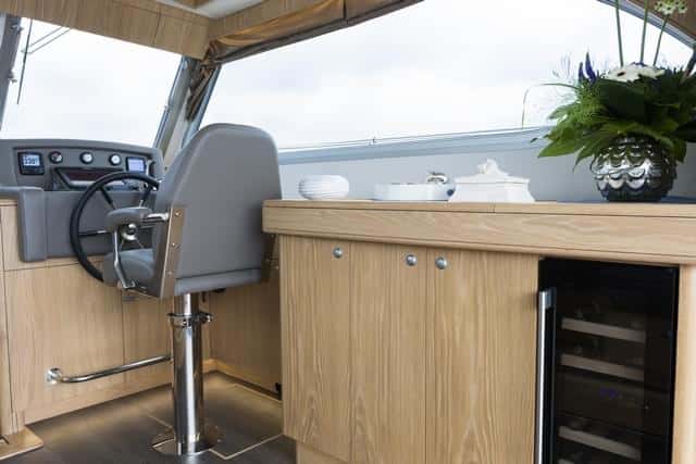 De todos modos, la mejor opción es con la cocina arriba, en comunicación con la bañera, de forma que presta servicio tanto al interior como a la parte exterior del barco. Sin embargo, en la unidad que navegamos, totalmente personalizada, se podrían recortar los ventanales para ganar todavía más visión panorámica. No obstante, el barco es espacioso, con un gran salón que comunica totalmente con la bañera.