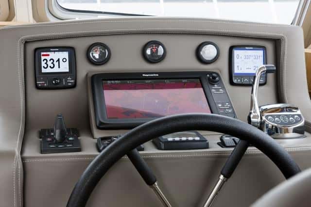 El panel, forrado en piel, deja espacio para una pantalla multifunción y los demás elementos de navegación, como el piloto, las hélices de proa y popa, la palanca electrónica del Yanmar y los indicadores del motor en una pantalla digital. Las tres partes del parabrisas son practicables, lo que facilita la ventilación. No falta un reposapiés de barra de inox, pero nos gustaría tener un compás y alguna guantera para los objetos personales.