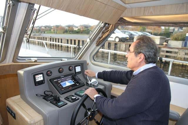 La NG 43, sin embargo, navega con un gran estilo marinero, dejando sentir su robustez de casco, y cortando la mar de proa sin el menor problema. Navegando en aguas de Ijsselmeer, el mar de los Países Bajos, bajo unas condiciones de marejadilla y viento fuerza tres, metimos a fondo y el Yanmar de 480 Hp respondió con una excelente capacidad de aceleración. En salida el barco planea en 8 segundos, y en 10 segundos más se pone a su máxima de 23 nudos. La aceleración evidencia el diseño planeador de la carena, pero la velocidad máxima, la limitación intencionada de potencia. La capacidad de giro es total, la gran pala de timón es muy efectiva en mar abierto, concediendo un giro de 360 grados con un diámetro de poco más de una eslora y media. Sin embargo, en puerto dispone de hélice de proa de serie y, opcionalmente, se ha instalado una hélice de popa, de forma que el barco se puede trasladar lateralmente o en cualquier sentido.