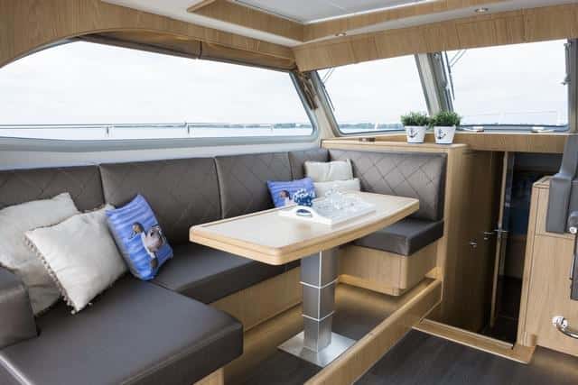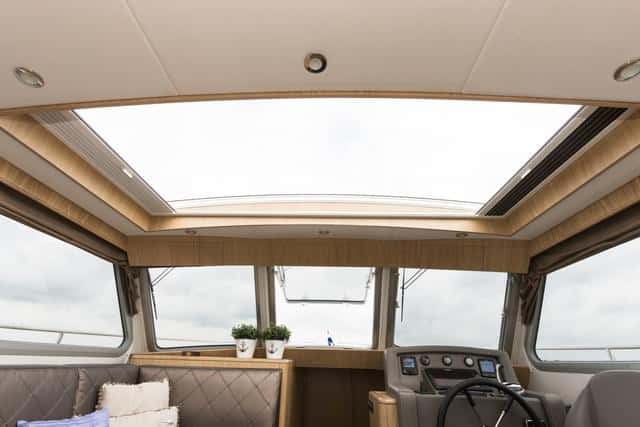Un gran sofá a babor con su respectiva mesa ajustable para transformar el conjunto en una litera doble, tiene frente a sí un mueble de servicio con la televisión que emerge y una mueble bodega climatizada. El plano superior es sobrio pero está bien decorado y, sobre todo, es luminoso. Destaca por el techo cenital transparente, que se abre totalmente mediante un sistema eléctrico, dejando la cabina al descubierto. Es uno de los detalles que más nos gustan de este barco.