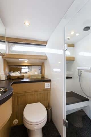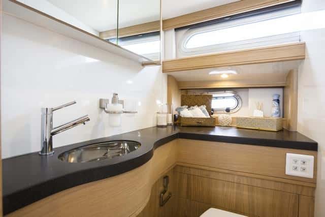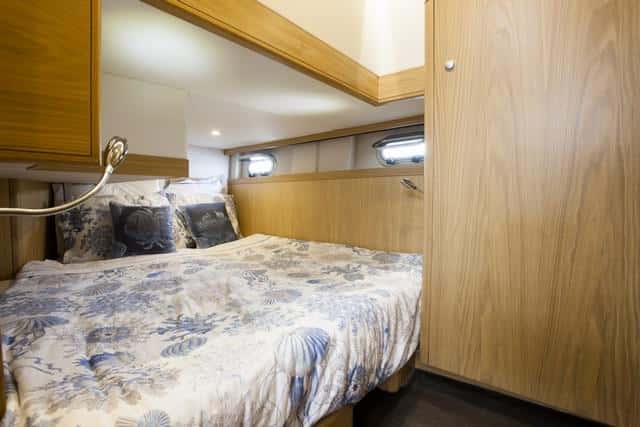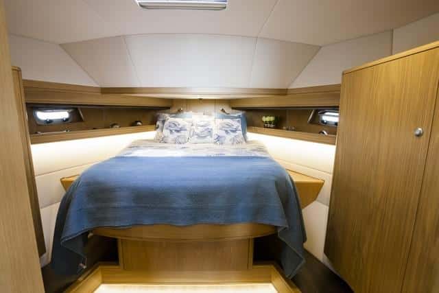 A proa la cabina presenta una cama bastante alta, con cajones en la parte inferior y armarios. En esta unidad el armador ha querido ubicar la cama muy a proa y ello ha obligado a elevarla. La sugerencia del astillero es colocarlas un poco más a popa para que quede más baja. La segunda cabina es grande, con una altura de dos metros en el espacio vestidos, con dos literas convertibles en una cama de matrimonio y armarios roperos enormes. Y el aseo, con ducha separada, inodoro y lavabo, impecable.