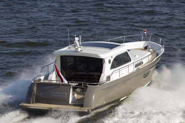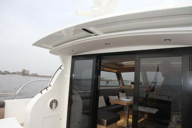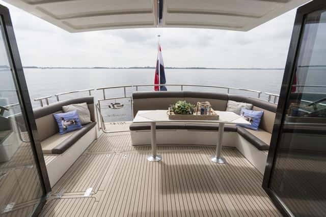 A pesar de ser un barco nacido bajo la mentalidad de los Países Bajos (y eso se refleja en la monomotorización, la calidad y la construcción en aluminio), dispone de buenos espacios abiertos. La bañera presenta unas dimensiones correctas y queda en comunicación con el salón gracias a la gran abertura de éste por las cuatro puertas de popa. Se puede cubrir con una toldina rígida que mediante un sistema eléctrico sale del techo de la cabina.
