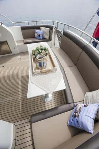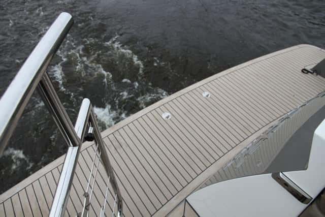 La teca, opcional, se complementa con los diversos puntos de agarre repartidos por todo el barco y los candeleros de inoxidable, que nos recuerdan la calidad de los grandes superyates.