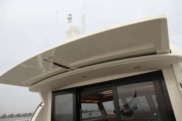 La plataforma de baño, con acceso directo, no tiene las dimensiones que acostumbran a ofrecer los 43 pies tradicionales, pero es suficiente, con ducha y escala de baño. Los pasos laterales con anchos y quedan perfectamente protegidos por la altura de la borda y los candeleros. Delante, se pueden montar las colchonetas de solárium, sobre la caseta de la cabina. La maniobra de fondeo nos recuerda las de un barco de mayor eslora, con el molinete exterior, y el ancla que asoma por el escobén situado en al amura de estribor.