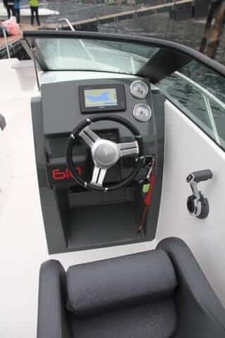 Se dispone de un buen reposapiés, hundido para ganar espacio y no tener que echar el asiento hacia atrás; tiene guantera y toma de 12 V, pero falta un compás y un asidero en la consola. La palanca de aceleración está bien situada a estribor y el parabrisas cumple eficazmente con su misión protectora del viento, y decimos estos porque se dejó notar el frío navegando a 5 grados de temperatura en el lago Maggiore en el mes de noviembre.