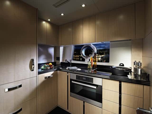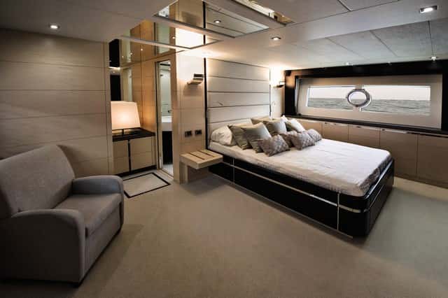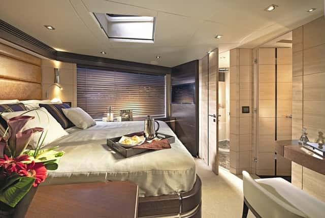 En la zona de noche, el diseño ofrece diferentes posibilidades de distribución, con tres o cuatro cabinas, siempre con la del armador en el centro del barco y a toda la manga. Todas las cabinas disponen de TV, sistema de audio y teléfono privado. En el caso que el propietario opte por disponer de solo de cocina, los invitados dispondrán de tres cabinas dobles, con la VIP en proa y las otras dos —una con literas individuales y la otra con cama doble— a ambas bandas. En el caso que se desee habilitar aquí un espacio de dinete con sofá en L y mesa, es obligado prescindir de una de las cabinas de invitados. Se gana en confort y espacio, pero se pierde en capacidad de pernocta a bordo.