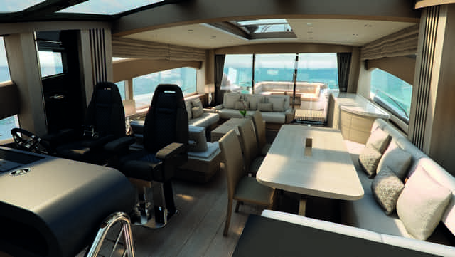 La ausencia de divisiones estructurales en el volumen interior de la cubierta principal ayuda decisivamente a potenciar esta sensación. Sin barreras visuales, el espacio interior adquiere toda su dimensión toda vez que el exterior se integra a bordo sin obstáculos proporcionando una perspectiva completa sobre el entorno.