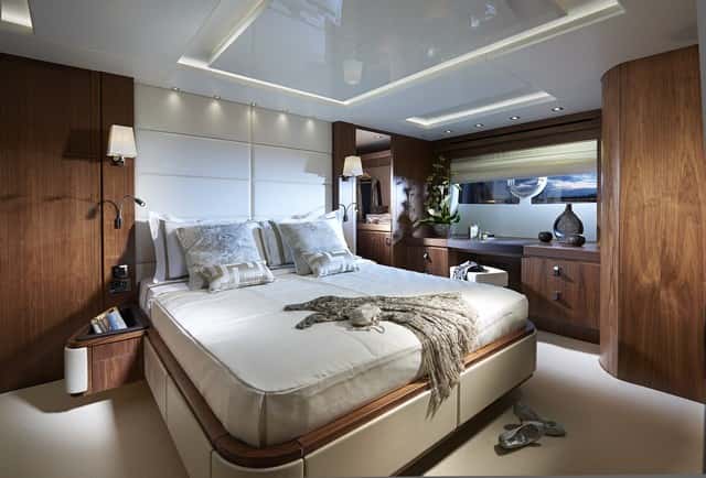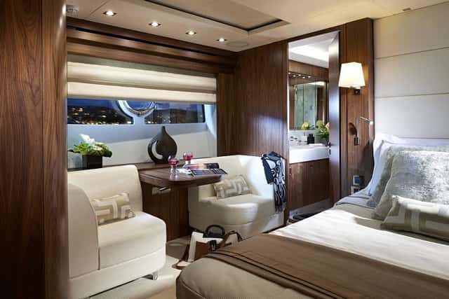 El propietario dispone de una cabina en el centro del barco y a toda la manga, con cama central. La banda de estribor se destina a un tocador longitudinal, que podrán reconvertirse si así se desea en escritorio, mientras que la de babor queda ocupada por dos sofás individuales jalonando una mesilla baja. A ambos lados de la cabecera de la cama una puerta conduce al baño, con ducha separada, y la otra en el lado contrario da paso al vestidor. No falta un televisor de 40” ni un completo sistema de audio, suficientes tomas de corriente y, por supuesto, aire acondicionado en todos los ambientes.