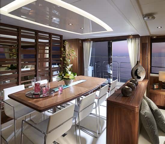 Así, la zona destinada exclusivamente a estar, situada como suele ser habitual en popa de la cubierta principal y jalonada por grandes cristaleras que recorren toda la superestructura, ocupa toda manga y queda funcionalmente separada del comedor propiamente dicho por un mueble bajo que no interrumpe el volumen toda vez que permite el paso por ambas bandas. A su vez, más a proa, un mamparo listonado en madera a modo de cuarteles facilita la continuidad visual hasta el puesto de gobierno y el rincón de estar de los acompañantes, que ejerce también como dinete.