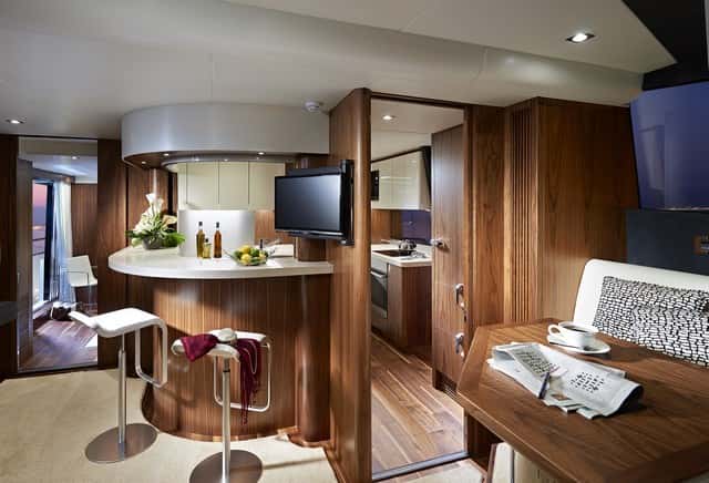 La cocina sirve a este espacio de comedor directamente a través de una puerta, pero también —y he aquí otro de los logros de este diseño— al espacio dedicado a los invitados que deseen acompañar al capitán junto al puesto de gobierno en algún momento de la navegación, disfrutar observando el mar cuando el tiempo no acompaña o sencillamente usarlo como dinete para disfrutar de un buen desayuno. Más aún, esta distribución de planta ha permitido a los diseñadores crear un verdadero bar con barra semicircular y taburetes altos pegado al mamparo que cierra la cocina.
