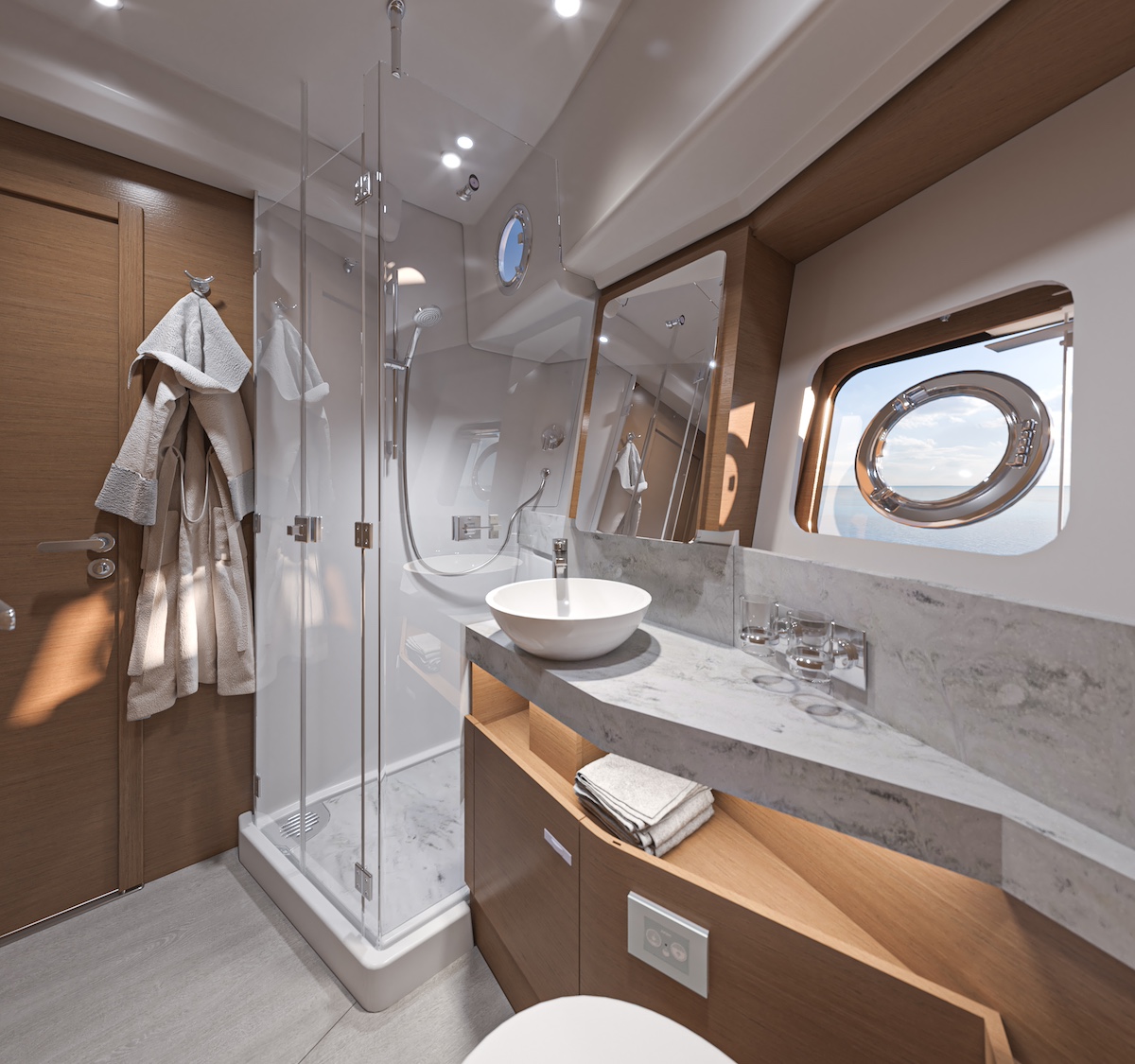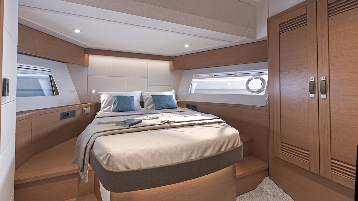 Tras superar unas cómodas escaleras, dispuestas junto al puesto de gobierno en la banda de estribor, accedemos a la cubierta inferior. Esta cuenta con tres confortables camarotes y dos baños. El camarote del armador, situado a popa, queda en la parte central de la embarcación y ocupa toda la manga. El camarote VIP o de invitados se sitúa en la zona de proa e igualmente comparte la habitabilidad, el confort y el diseño del camarote principal. Finalmente, el tercer camarote, situado entre las dos cabinas principales, se ha planteado con dos literas individuales, resultando ideal para los niños o invitados ocasionales. Las dos cabinas de aseo disfrutan de muy buena altura, espacio y ducha independiente. Todas las cabinas cuentan con armarios, así como alfombras de estilo bereber con capas inferiores acústicas y paneles con respaldo de espuma en los mamparos para reducir los niveles de ruido.