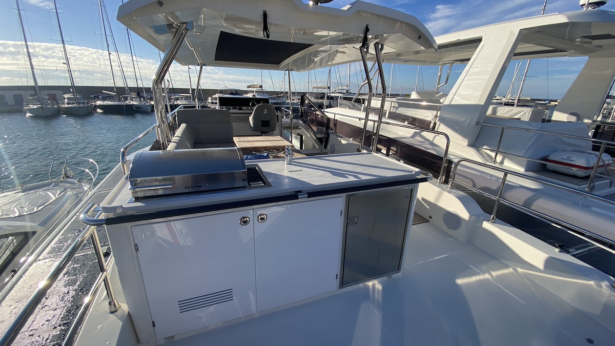 Su diseño exterior actualizado facilita la vida a bordo, a la vez que aporta comodidad y seguridad. Una de las principales características exteriores de esta embarcación es la adopción del concepto de “Terrace to the Sea”, que conlleva grandes espacios, así como un generoso y completo flybridge con multitud de asientos y detalles de lujo, como el mueble de cocina con grill o el techo rígido con apertura superior eléctrica.