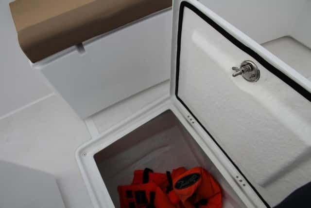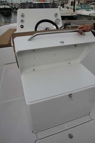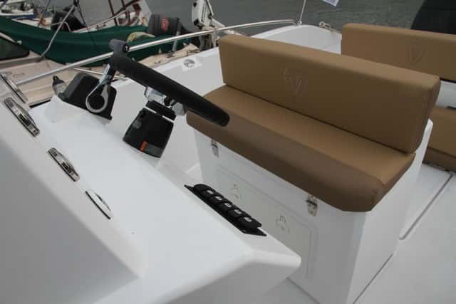 Sin embargo, dos son los aspectos destacables en este diseño. Es un barco espacioso, de fácil y cómodo tránsito de proa a popa; y disfruta de un alto francobordo protegiendo eficazmente la bañera. Por otra parte también es importante la capacidad de estiba que encontramos en este modelo, con varios cofres bien repartidos, bajo los bancos de proa, en el piso de la bañera, bajo el asiento del piloto y en popa.