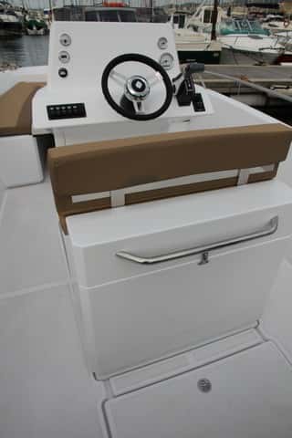 Está bien diseñado y protege eficazmente al piloto. El panel, alto, deja espacio para una pantalla grande y la palanca de aceleración queda bien situada a estribor, con el pulsador de power trim por la parte interior, como debe ser. El banco doble permite acomodar a dos personas, aunque el acompañante en este caso queda algo desplazado al estar el volante en el centro.