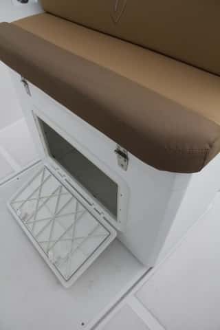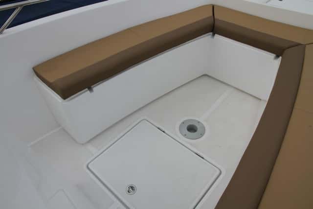 La distribución de este modelo es la clásica de una center console, donde destaca el módulo central con el banco a popa, dejando los pasos directos a las plataformas de baño, y el sofá en V de proa convertible en dinete o en solárium, con los correspondientes cofres debajo. Tampoco falta un buen cofre en el piso de popa, ni un correcto cofre de anclas.