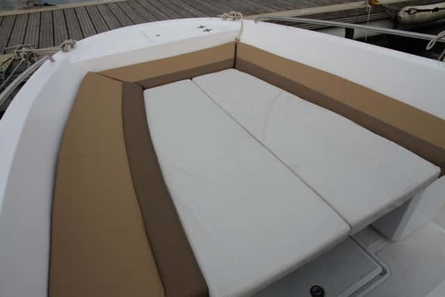 La proa presenta la configuración clásica con banco convertible en solárium o dinete.