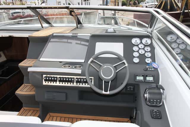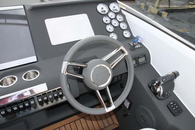 En la parte inferior se ha previsto una guantera alargada y junto al volante la fila de interruptores del barco. Cubriendo la parte izquierda de la consola no faltan dos portavasos y una tapa de metacrilato que hace de mesa de cartas.