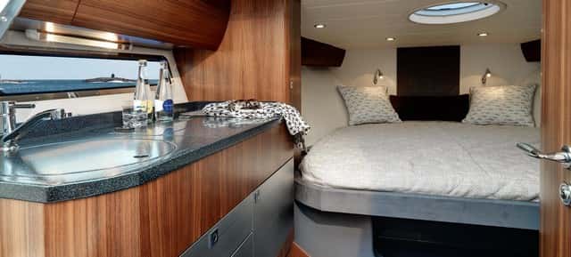 La nevera queda fuera, en un cofre en el piso de la bañera. Debajo de la cama hay espacios para estiba y la cabina cuenta con tragaluces laterales y una escotilla circular cenital, que garantizan luminosidad natural y ventilación. Está bien decorado, con tapizado en los costados, aunque sin estantes a lo largo de las amuras, tiene luces de lectura y el espacio destinado al inodoro, a nuestro juicio algo justo en sus dimensiones, se ha realizado en contramolde de fibra, práctico y limpio, y no le faltan el lavabo y la ducha.