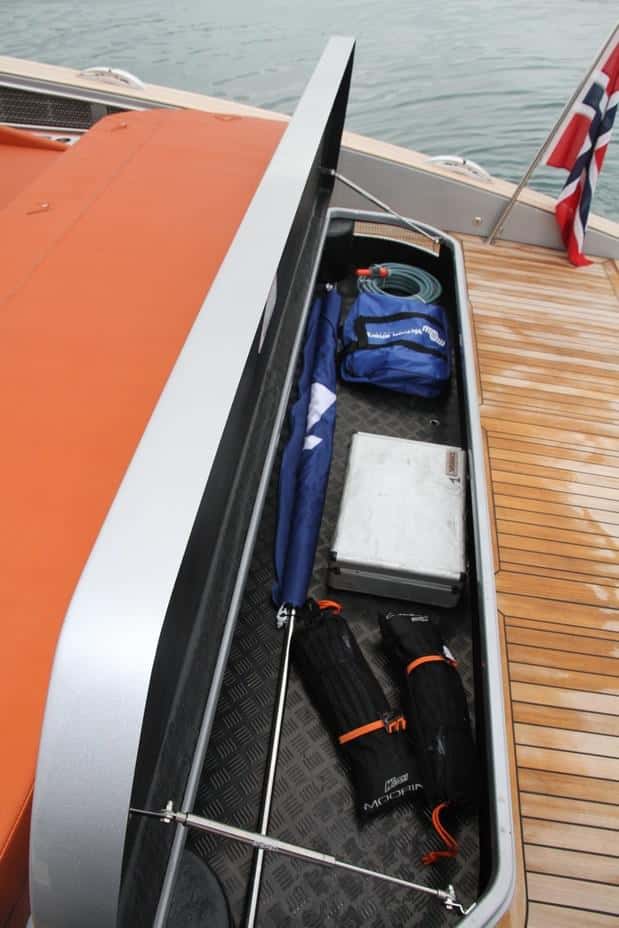 Todo el contorno del barco va reforzado por un bordón de caucho especial, propio de los grandes ténder para protegerse de los golpes cuando se abarloan al superyate. También se puede montar la escala lateral lollipop, denominada así por los palos barandilla que salen de la boda, similares a la imagen de los caramelos de palo, o chupa chups.