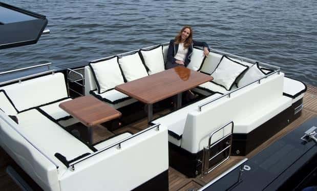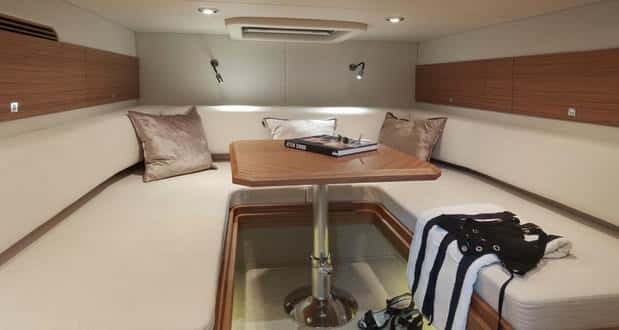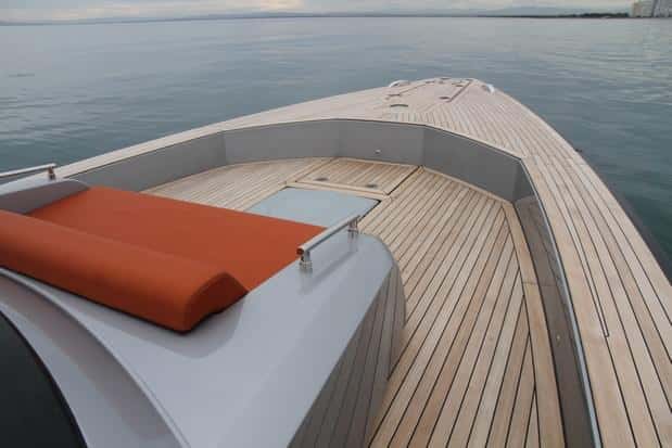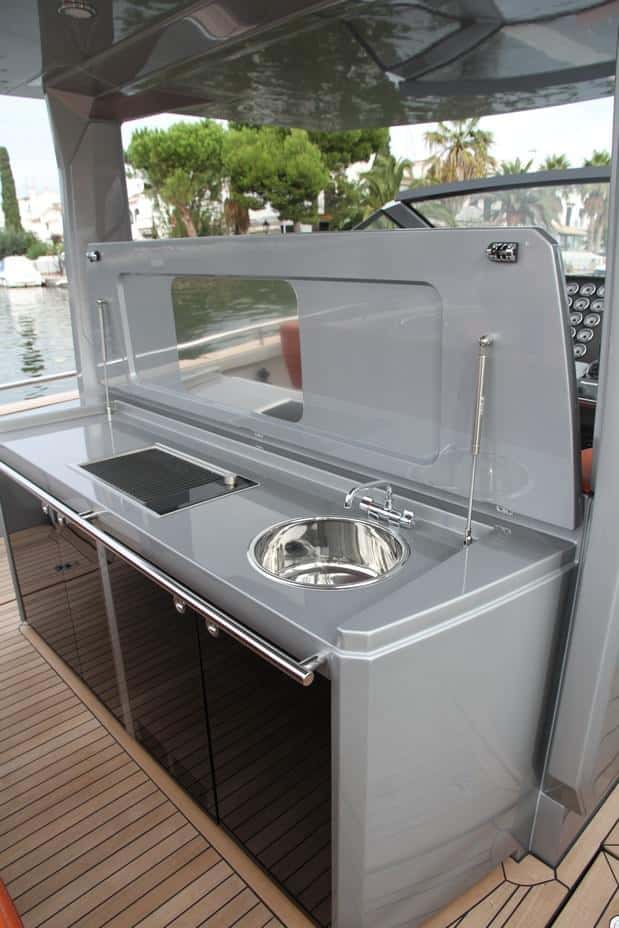 En definitiva, un barco con una zona abierta extraordinaria, ya que en este tamaño de eslora pocas veces el mercado ofrece modelos totalmente abierto, con tantos detalles y de tal calidad, como la teca, la cocina, el sistema de solárium de popa, los cofres repartidos por todo el piso, y un largo etcétera.