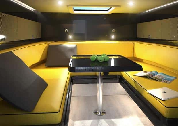 En este caso, como en las unidades producidas hasta el momento prácticamente no hay dos iguales. El armador puede escoger entre un sinfín de maderas, tapicerías y materiales para configurar una cabina totalmente a su gusto. Sin embargo Windy ofrece dos posibilidades básicas: una en la que la cabina se prolonga ocupando hasta la misma proa, dejando la cubierta sobreelevada delante; y otra más corta, en la que se respeta la bañera delante. En cualquiera de los dos casos no falta un aseo completo y una dinete convertible en litera para dos personas. Fibra de carbono y colores vivos determinan la decoración para los amantes de gustos más atrevidos y deportivos; y maderas en tonos claros con tapicerías más suaves, para quienes prefieran una decoración más discreta y elegante.