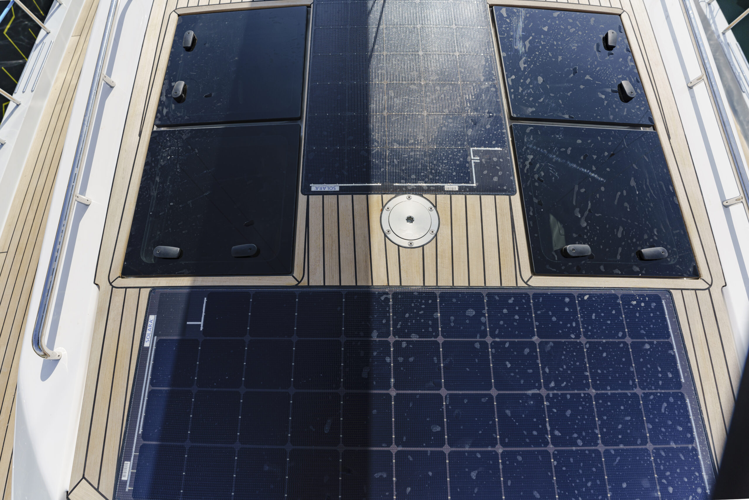 La ventaja del sistema Servoprop 30 kW de Oceanvolt es que, navegando a vela, aprovecha el giro de la hélice para hidrogenerar hasta 5 kW y recargar sus propias baterías. También se han dispuesto paneles solares, pero solo alimentan las baterías de servicio. Aunque seguramente la cualidad más apreciada de esta motorización es el silencio.
