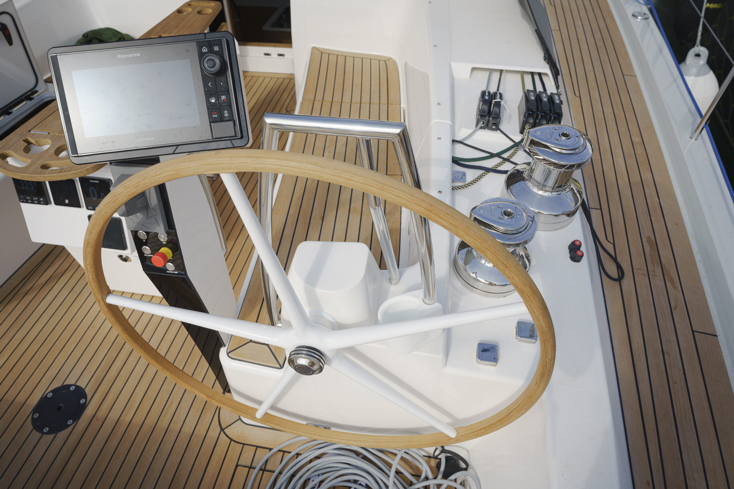 La maniobra está reenviada a los puestos de gobierno desde donde es posible controlar todos los reglajes. Cuenta con la asistencia de dos winches Andersen por banda, que incorporan el nuevo sistema de velocidad variable según la intensidad de la presión sobre el botón: a más presión, más velocidad. Prácticamente no es necesario ir a maniobrar a proa salvo para colocar unos cojines y disfrutar del paisaje en un fondeadero.