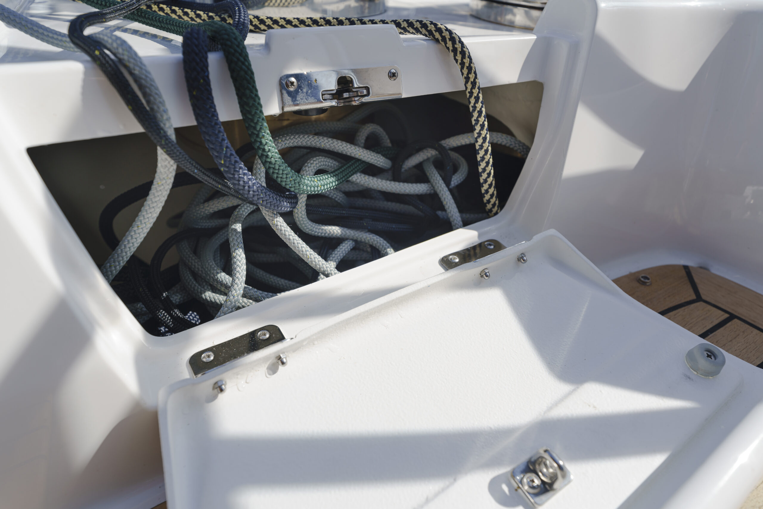 La maniobra está reenviada a los puestos de gobierno desde donde es posible controlar todos los reglajes. Cuenta con la asistencia de dos winches Andersen por banda, que incorporan el nuevo sistema de velocidad variable según la intensidad de la presión sobre el botón: a más presión, más velocidad. Prácticamente no es necesario ir a maniobrar a proa salvo para colocar unos cojines y disfrutar del paisaje en un fondeadero.