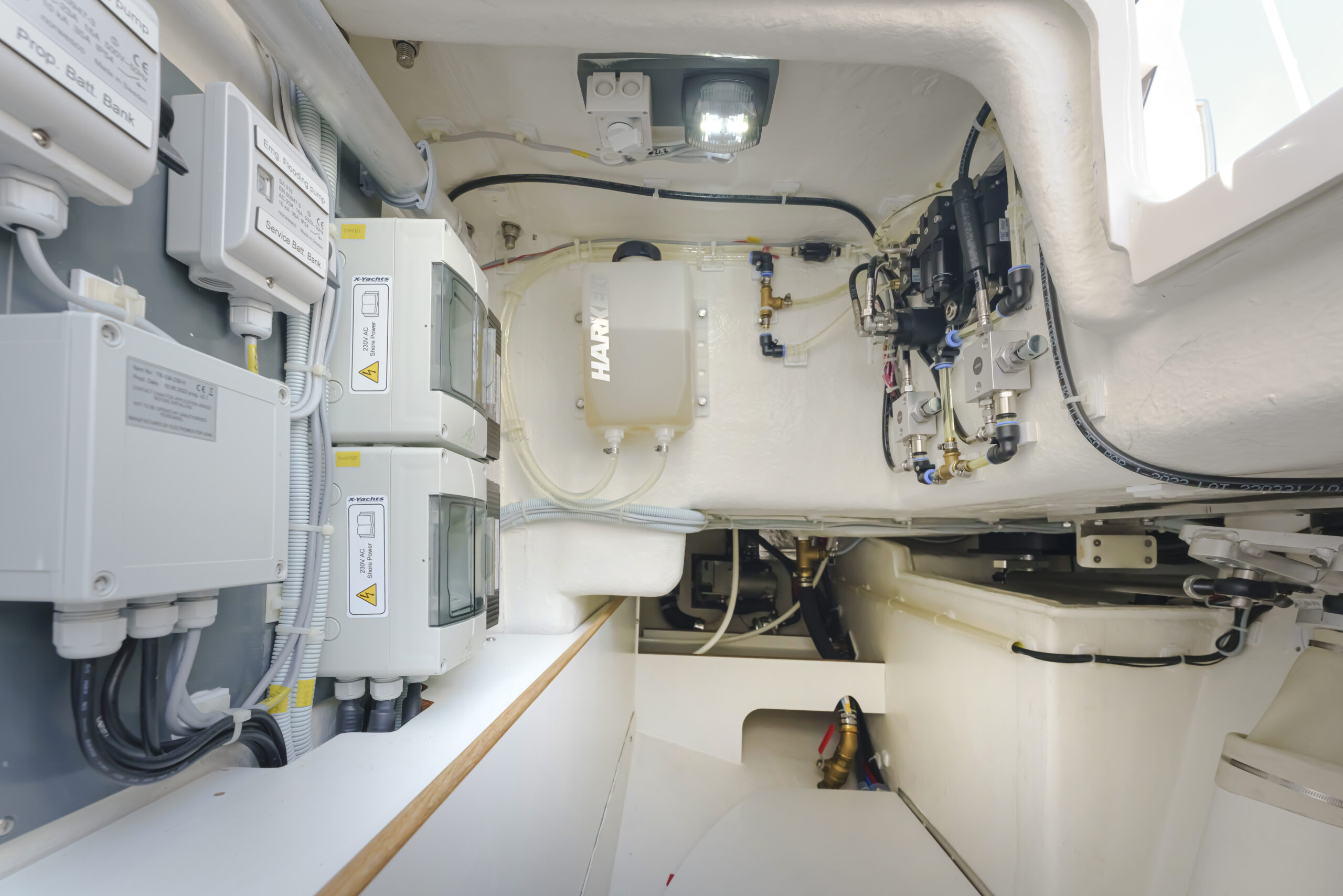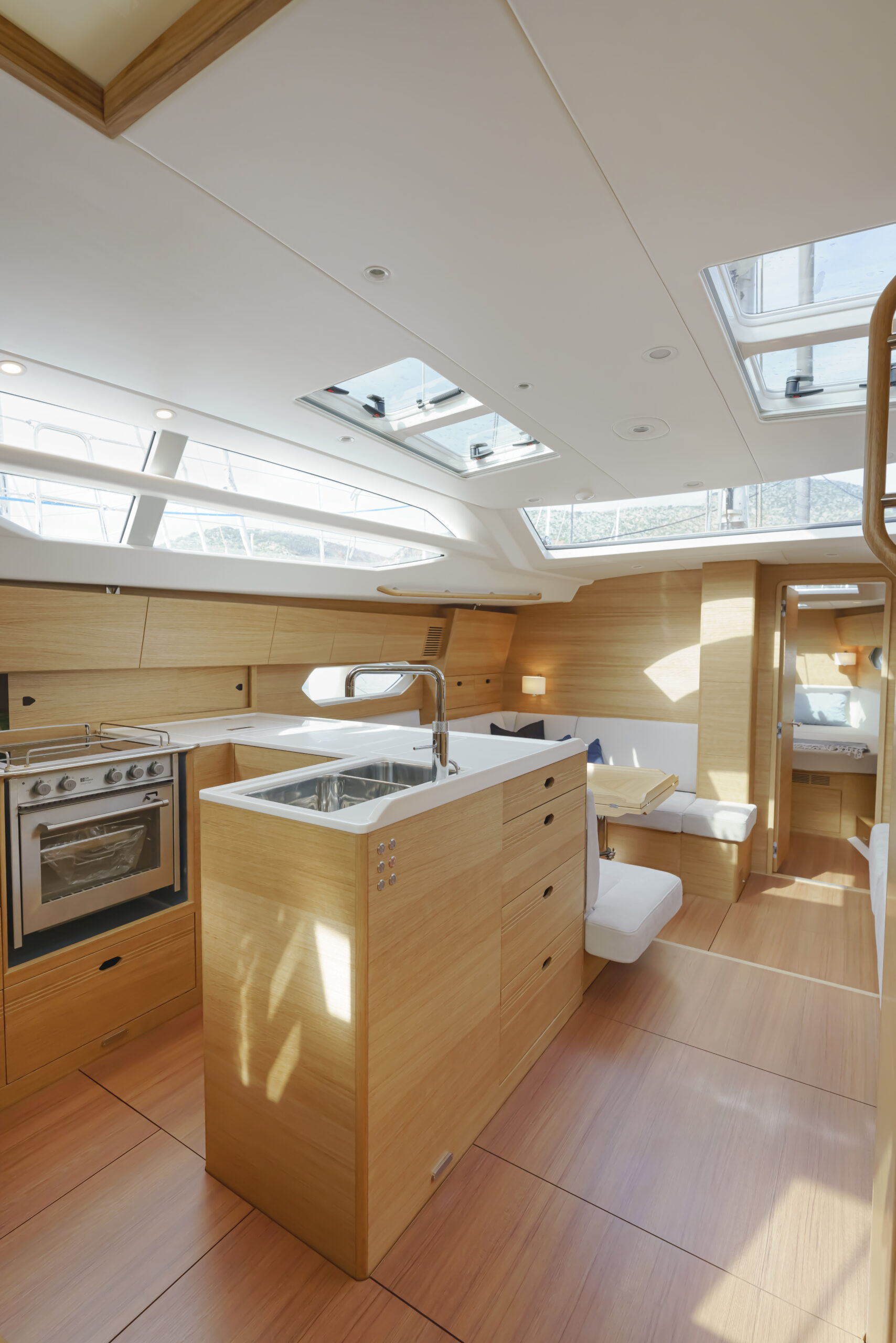 Al bajar las escaleras, la zona de la cocina y la mesa de navegación se encuentran más elevadas que el resto. Esto permite ver muy bien el exterior por las ventanas laterales y las del techo, pero el motivo del suelo elevado es otro. Debajo de esta área se han instalado una buena cantidad de elementos técnicos, como los compresores del aire acondicionado y las neveras, la potabilizadora o un compartimento donde se encuentran todos los grifos que reparten el agua en el barco. Otra ventaja extra de esta disposición es que la insonorización de todos estos elementos es más efectiva.