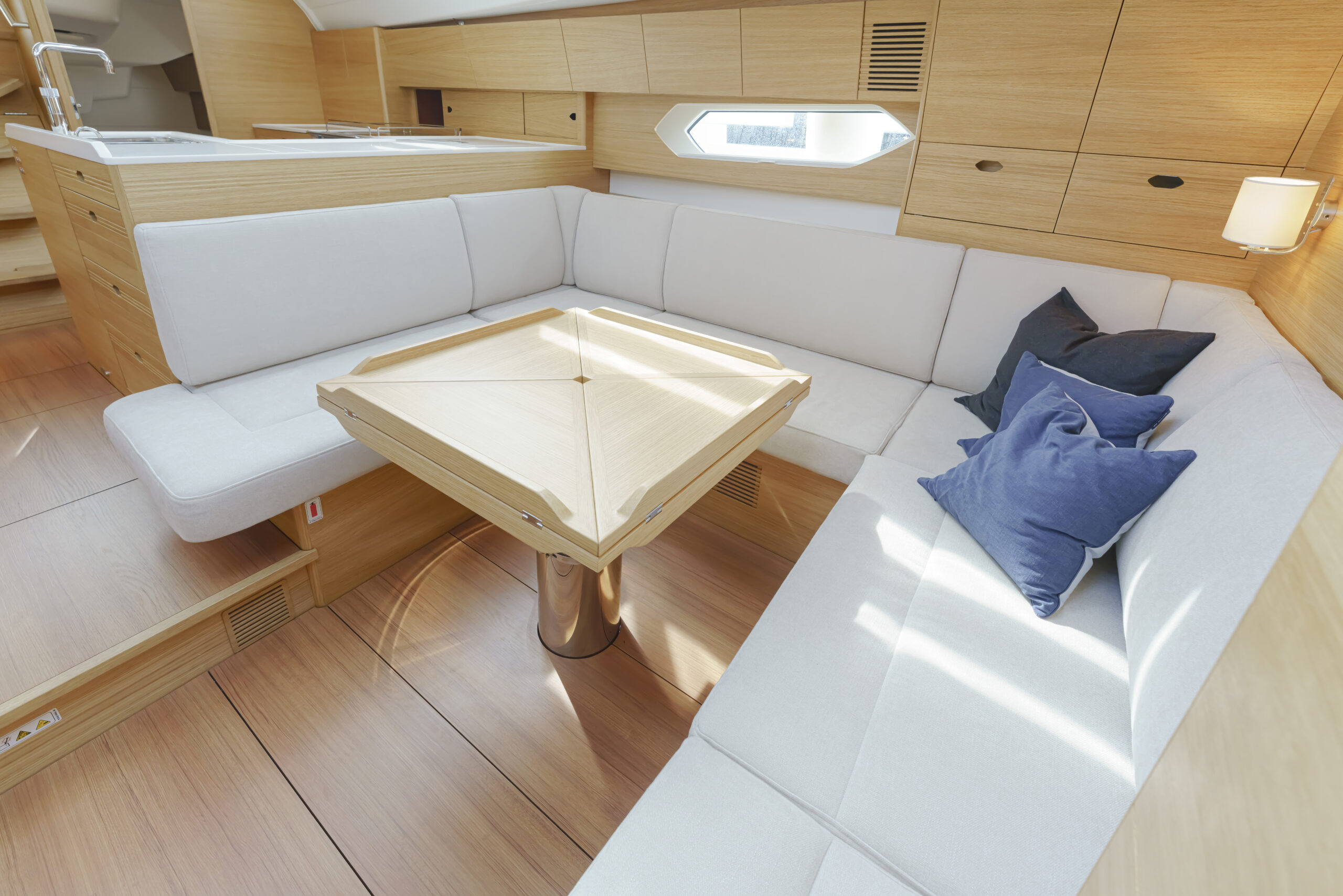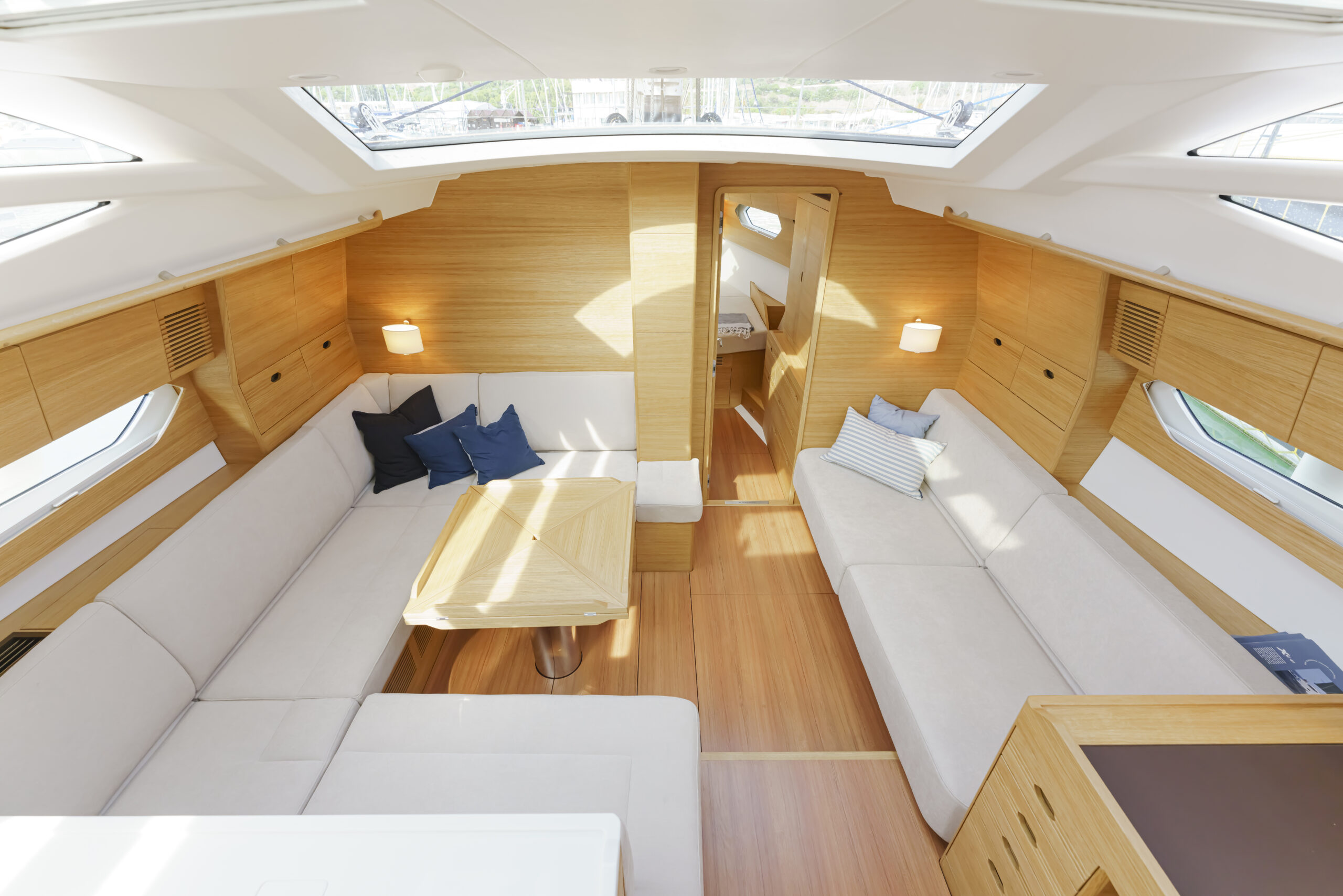 El estilo del diseño es actual, atemporal, de una elegancia simple que no necesita sorprender sino que ofrece cobijo, descanso, relax. Los colores claros y la abundancia de luz natural recrean un ambiente protector. El diseño en general mantiene una idea relajada de la navegación. La cubierta en un nivel, sin escalones, conecta de popa a proa con un tránsito seguro, de pasillos laterales anchos y con una imagen exterior estilizada. En proa el espacio es generoso pues el palo ha sido ligeramente retrasado, pero el sitio destinado a la vida exterior es la bañera que se encuentra bien protegida por la cabina y las brazolas que acaban casi en popa.