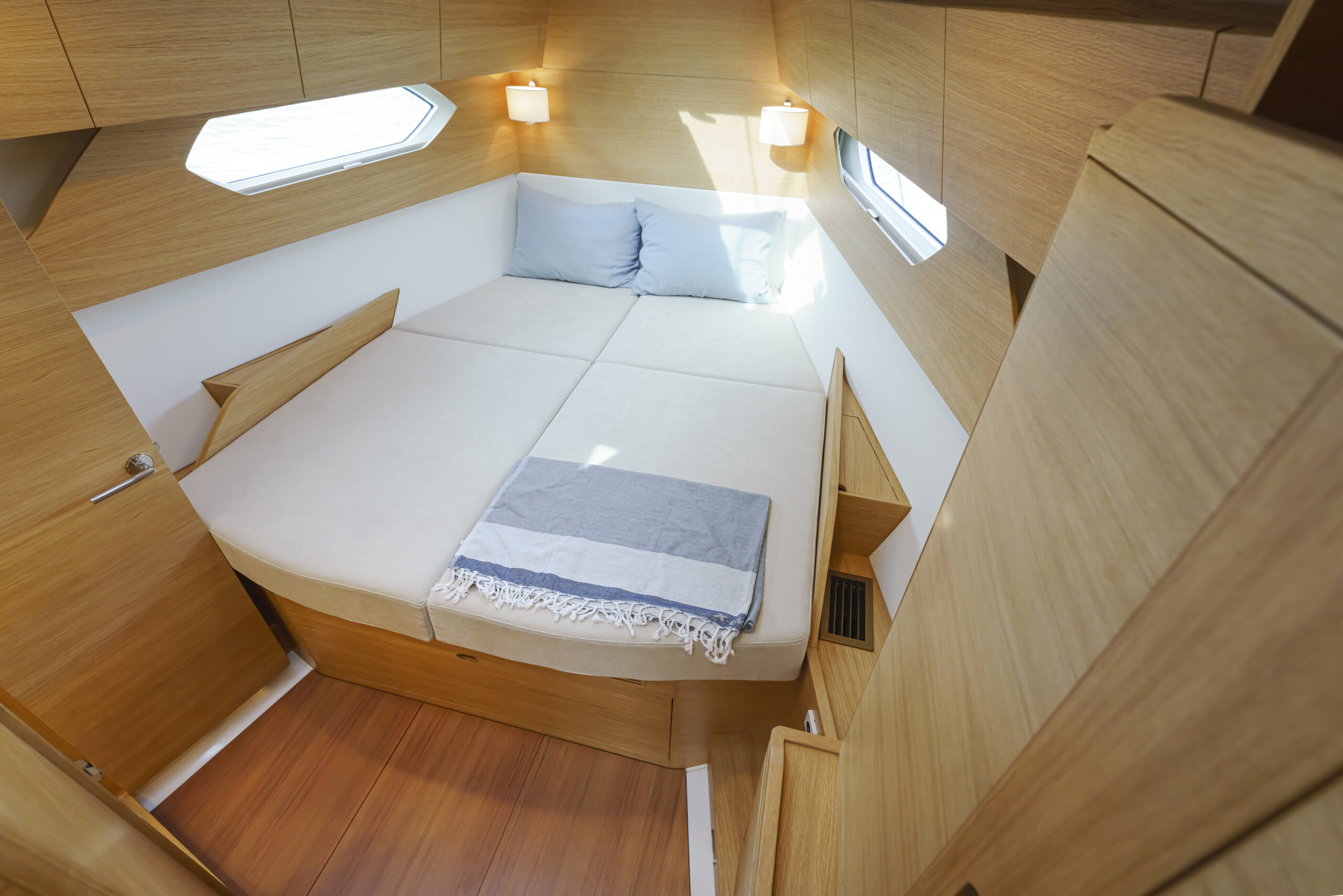 El salón queda en la zona más baja, pero goza de las ventanas de casco para no perder el contacto visual con el exterior. La cabina principal, situada en proa, mantiene el estilo de diseño e incluye un baño de generosas dimensiones.