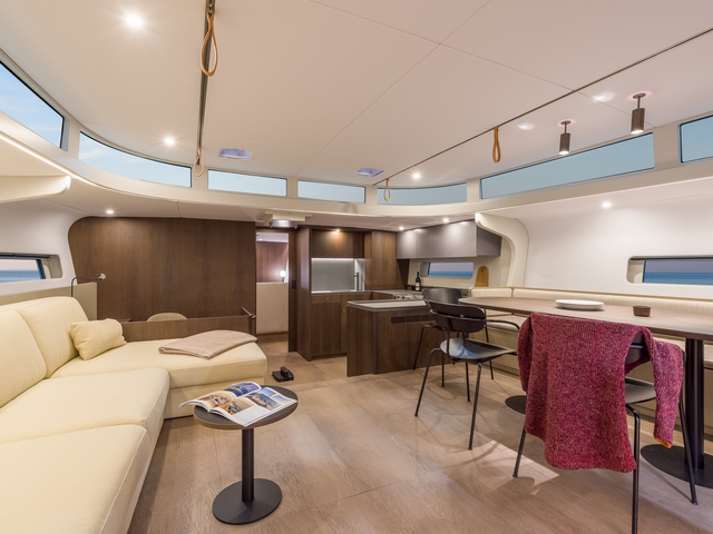 La versión en que navegamos equipaba una cabina aproa y dos en popa, la de babor como hemos dicho para tripulación. El salón ocupaba toda la manga con un gran sofá con chaise longue en babor mientras que, a proa, esta banda quedaba ocupada dos escalones más abajo, por un despacho con una gran librería. La banda de estribor se destina en el Bella íntegramente a cocina. Una distribución que varía en la próxima unidad en la que la cocina es mayor y no hay despacho.