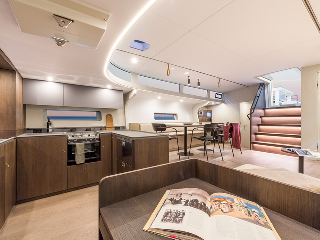 Por tanto, nada que objetar desde el punto de vista de la maniobra y tampoco por lo que respecta a la distribución de la cubierta y la atmósfera de calidad de vida al aire libre y el confort que procura: el espacio de estar, bien protegido por un toldo sobre puntales móviles, es espacioso, con dos mesas de alas desplegables y sofás de base amplia y respaldos cómodos, al igual que los dos grandes asientos acolchados mirando a popa, sobre las dos cabinas. A este espacio hay que añadir el solárium sobre el tejadillo de la caseta, totalmente plano, que proporciona otra área de relax en navegación o fondeo.