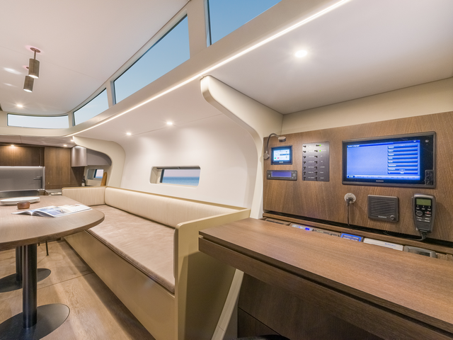 La visión al exterior y la luz natural queda garantizada por las ventanas del casco y la cristalera vertical que se extiende a lo largo del perímetro de la caseta. Una forma que, a la vez que define estética y formalmente el barco desde el exterior, impide la entrada de la luz directa del sol y, en consecuencia, reduce los requerimientos de climatización.