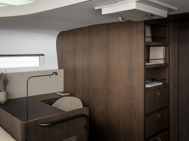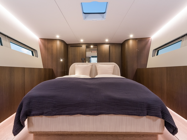 Y de hecho lo logró ya que estos criterios son claramente perceptibles desde el momento en que uno sube a bordo. El casco es ultraligero, realizado en sándwich de carbono —salvo en la parte alta en que es monolítico con resinas epoxy— al igual que la cubierta, y los mamparos también son en sándwich no estructurales. El capitán, y un tripulante si se desea, disponen de una cabina con dos camas y baño propio en popa, algo justa pero suficiente, con acceso desde cubierta y desde el interior.