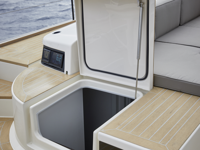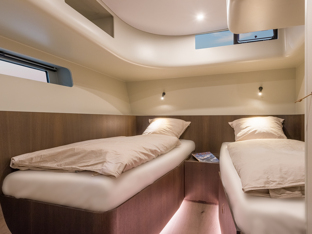 Y finalmente, algo especialmente destacable: los motores y todos los sistemas —generador, potabilizadora, etc…— están situados en un compartimento bajo el plan al que se accede levantando las panas. Aquí encontramos dos cajas contenedoras, una para motores y otra para sistemas, que se construyen y montan fuera del barco y después se traslada al interior. Un reflejo más de esta voluntad de hacerlo todo cuanto más simple y accesible mejor. También ilustra esta simplicidad el que los motores son dos Nanni diesel no electrónicos de 80 caballos con eje y hélices de dos palas plegables Hay que decir sin embargo, que en las próximas unidades los motores son Saildrive. En aras a la simplicidad, tampoco hay un sistema de bus que controle los sistemas eléctricos sino que todo funciona mediante los fusibles clásicos.