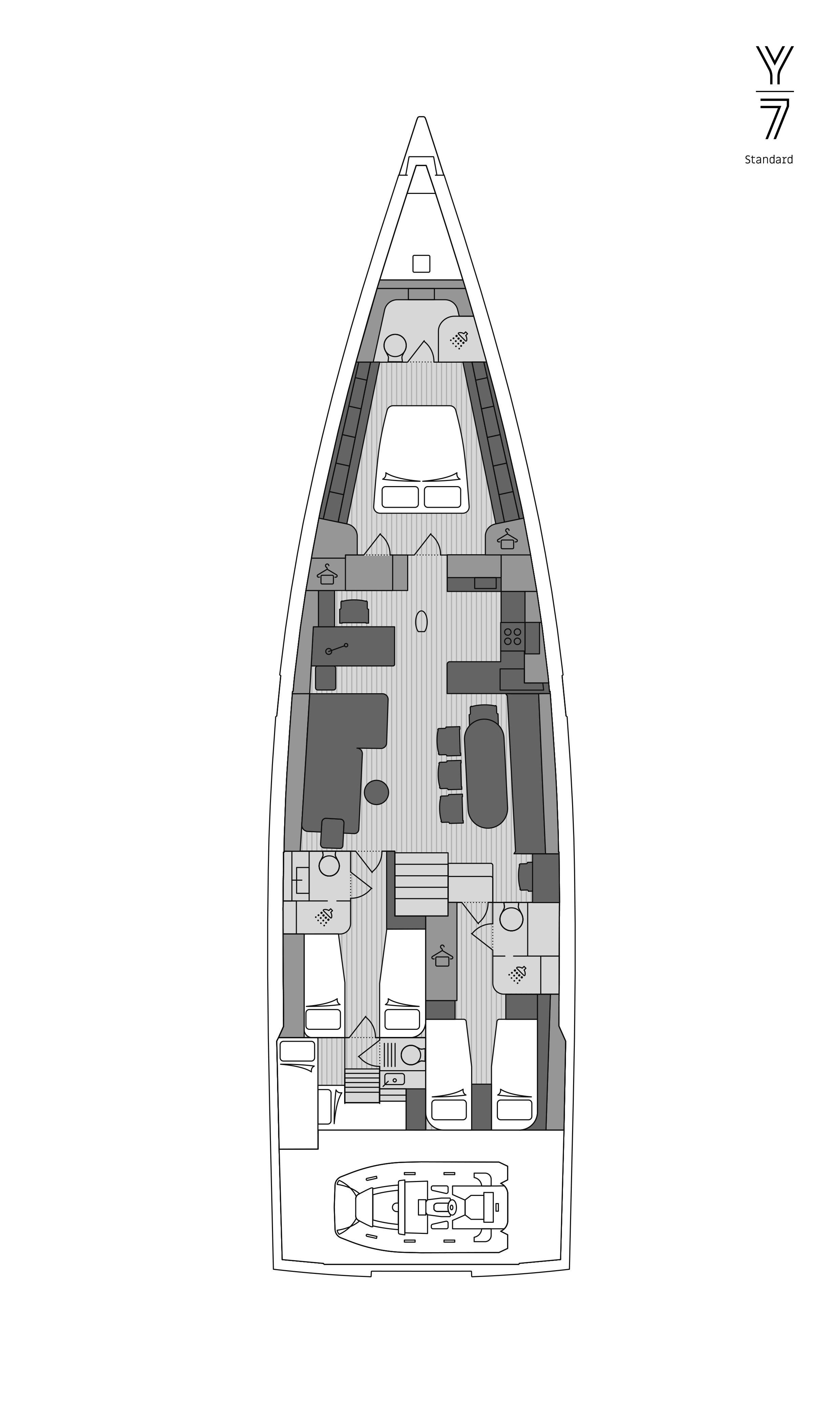 “Muchos barcos en el rango de los 70-100 pies están construidos como proyectos one-off” —comenta Bill Tripp. “Nosotros hemos trabajado con Michael Schmidt Yachtbau para diseñar e ingenierizar series de barcos con los mejores materiales en un proceso de producción que no obligue tener que reinventar la rueda cada vez que se construye uno, pero al tiempo manteniendo la máxima flexibilidad en la distribución de los espacios. Con cinco configuraciones diferentes de cabina, el Y7 responde a las necesidades de los armadores más diversos”, concluye.